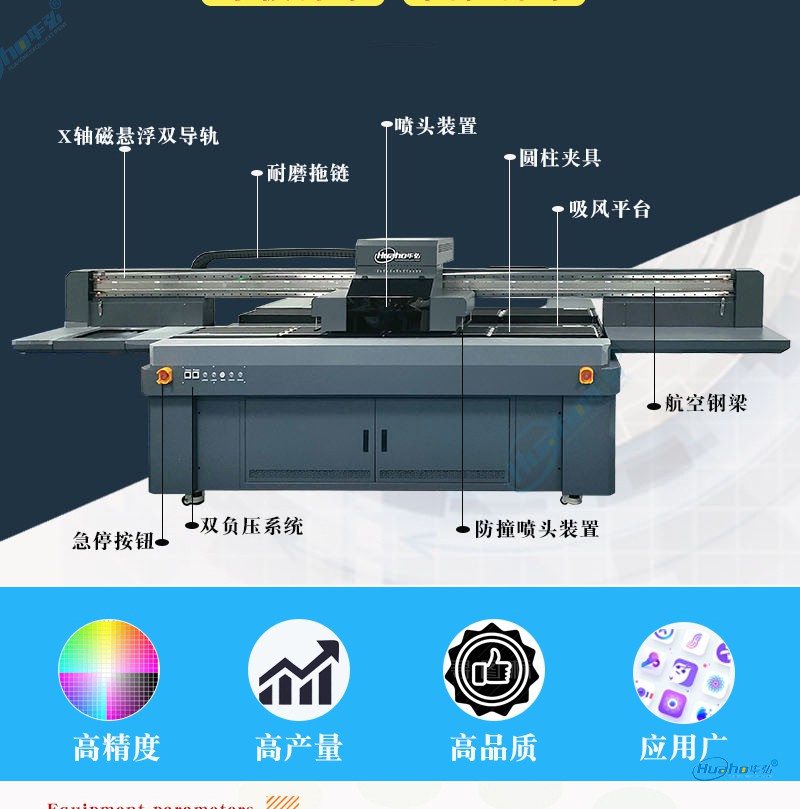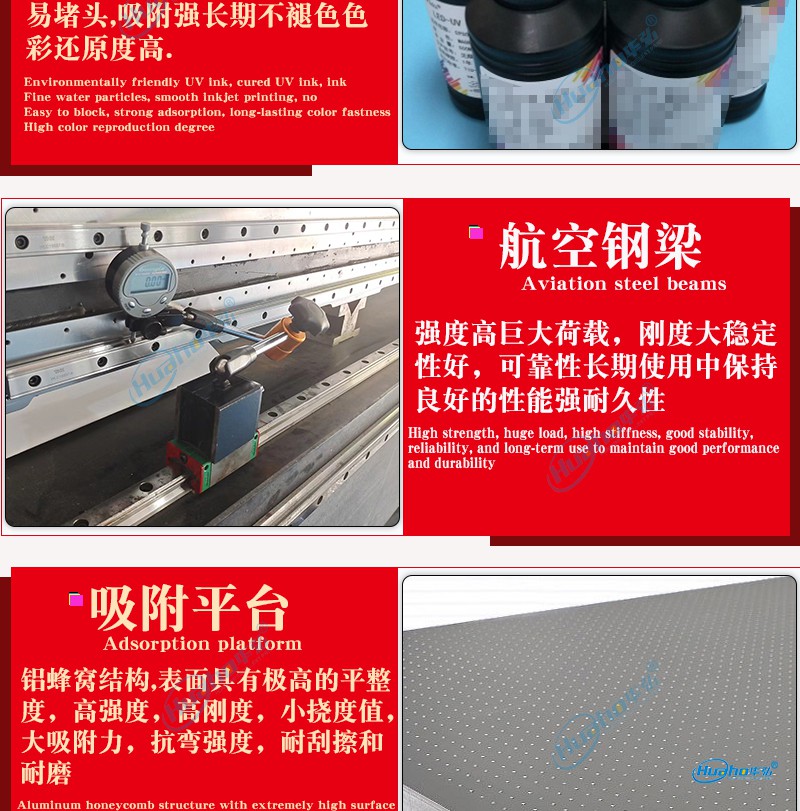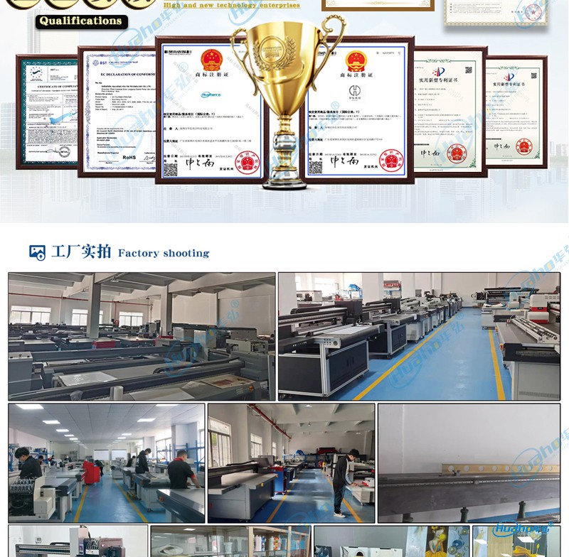 此外,华弘优印科技品牌直销拥有5000多平米生产基地,其工业级理光UV平板打印机速度快、精度好、稳定性强。特制重型机架及精钢导轨梁,整机表现稳定可靠,高品质进口电机及双导轨设计,满足画面对色彩密度的需求。出众的稳定性,无震荡稳定运行,定位准确,误差低至0.01MM。