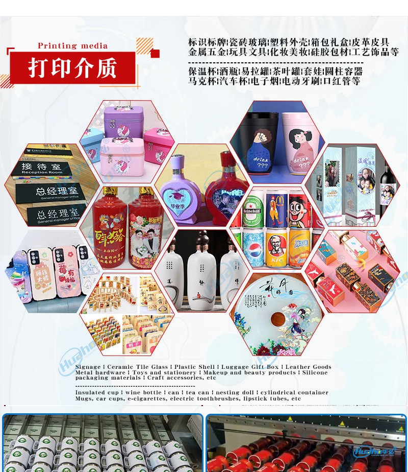 华弘平圆/圆平打印机,特别是华弘优印品牌推出的型号,如HH-2513平圆机,是一款可以满足客户打印平面和曲面圆柱体不同需求的多功能UV打印机。这款打印机采用全新方案,实现工业级自动化生产,具有更高效率、更少工序、更低成本的特点,效率提升可达一倍。